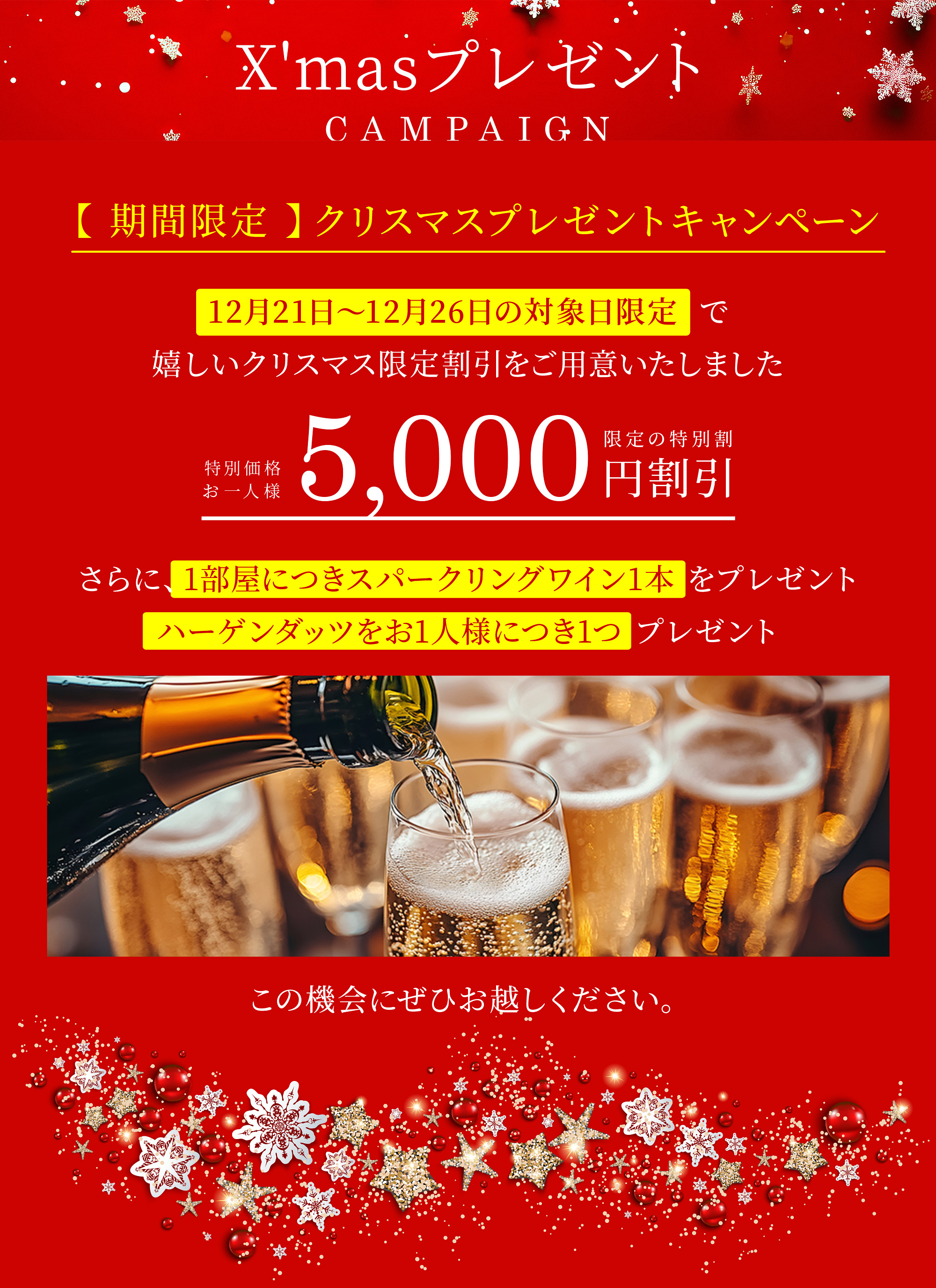 冷蔵庫内のお飲み物を全て無料でお飲みいただけます!約10,000円相当(コーラ、オレンジ、ジンジャエール、ウーロン茶、ビール、冷酒)をご用意しております。
